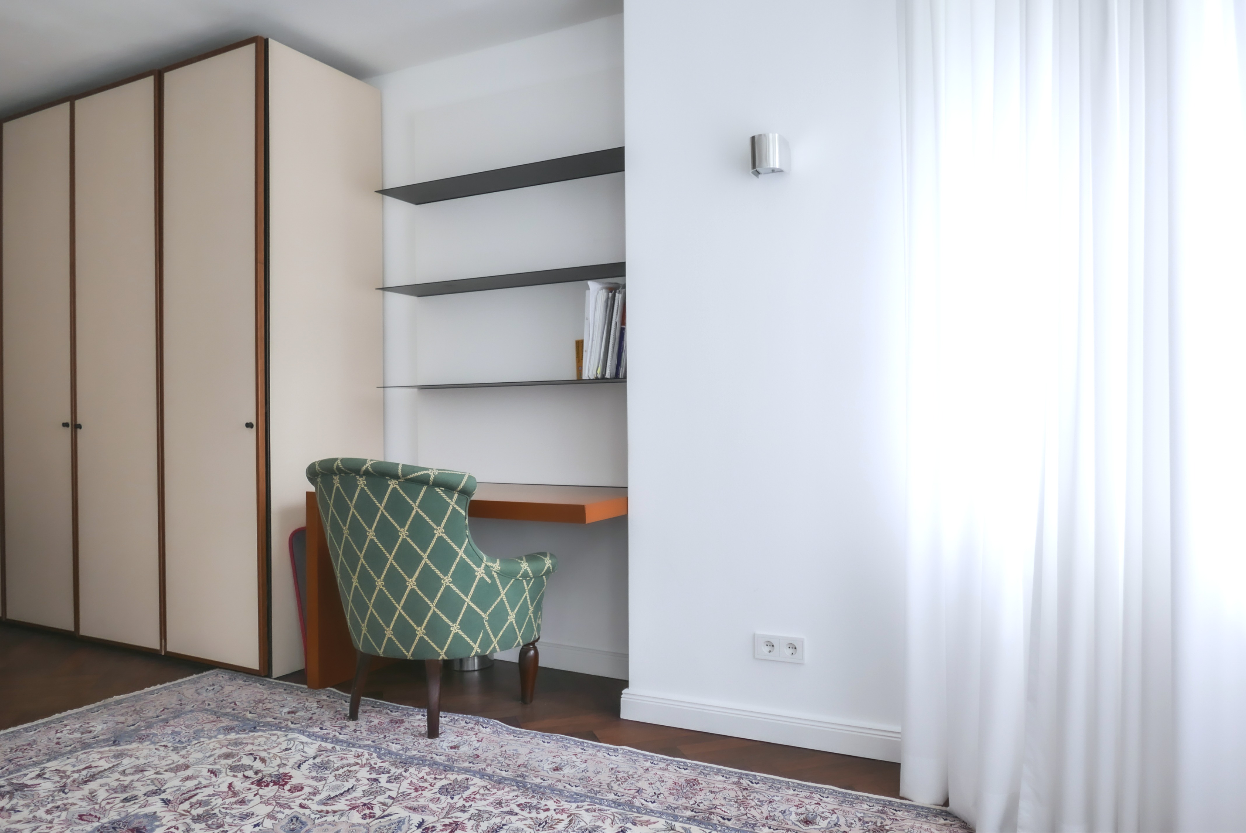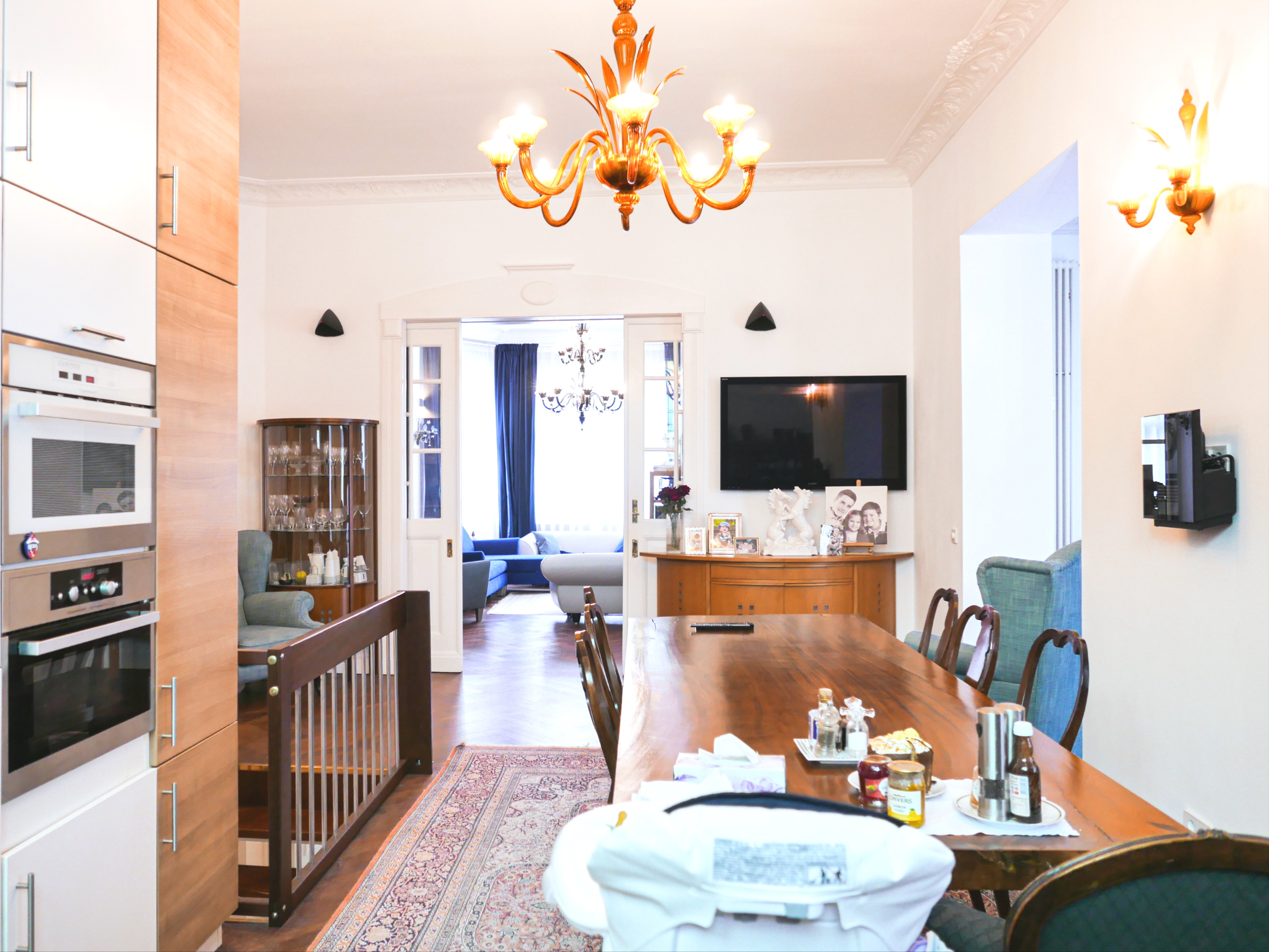 Besonders hervorzuheben ist der Kamin, der an kühleren Abenden eine ganz besondere Gemütlichkeit verströmt. Die gesamte Wohnung ist mit afrikanischer Eichenparkett sowie hochwertigen und stilvollen Einbauten ausgestattet, die den charakteristischen Charme des Altbaus perfekt ergänzen.