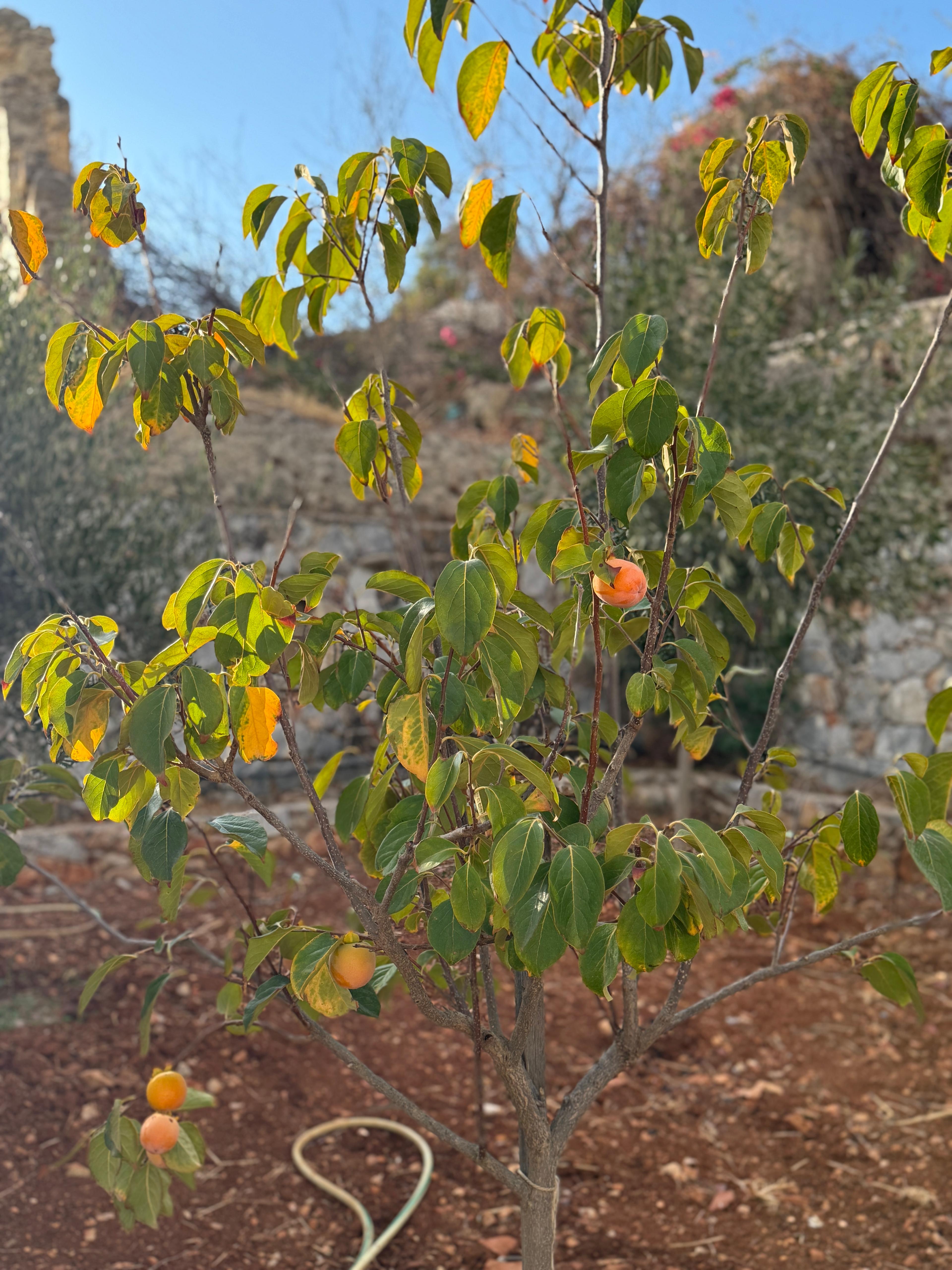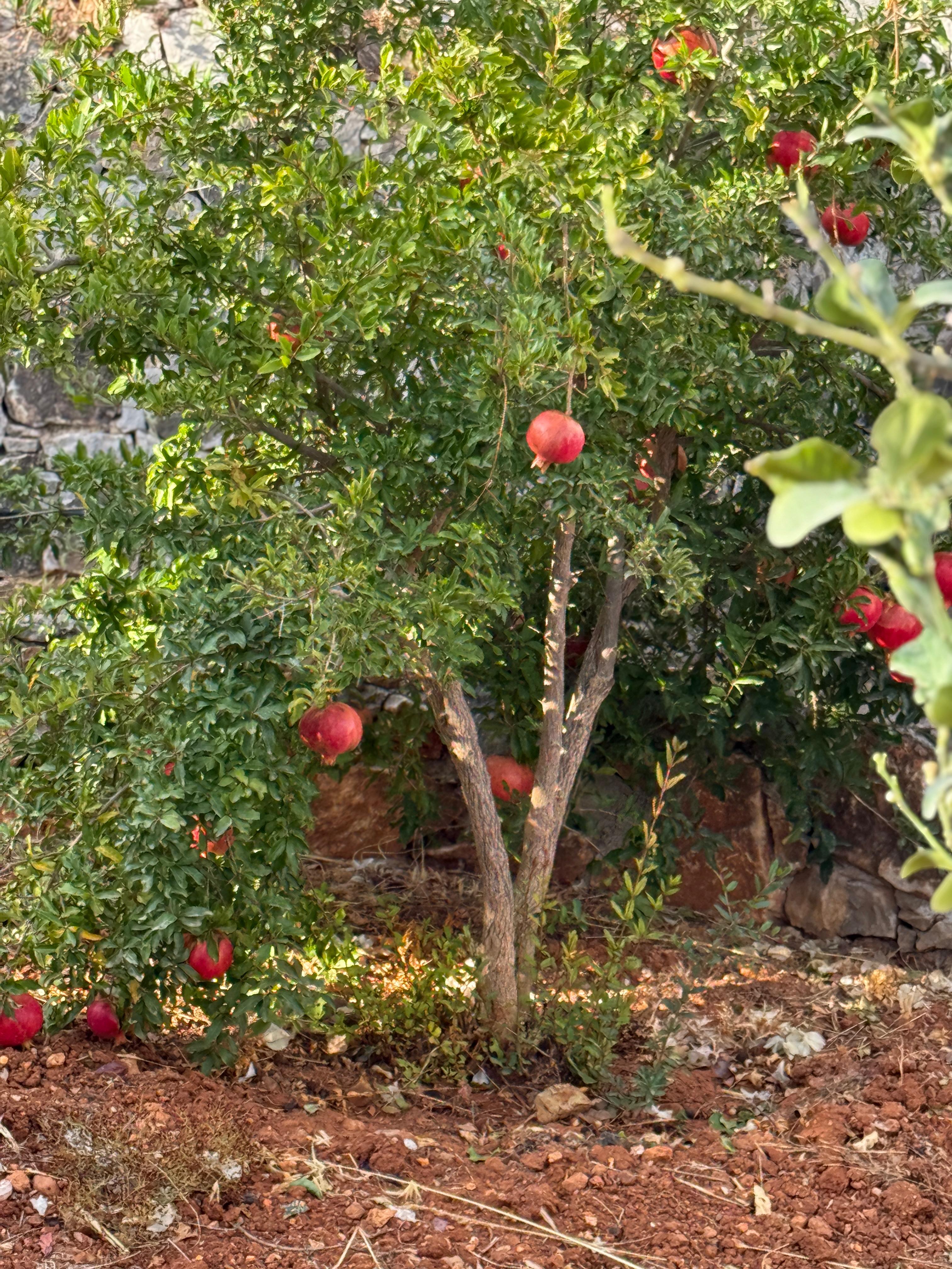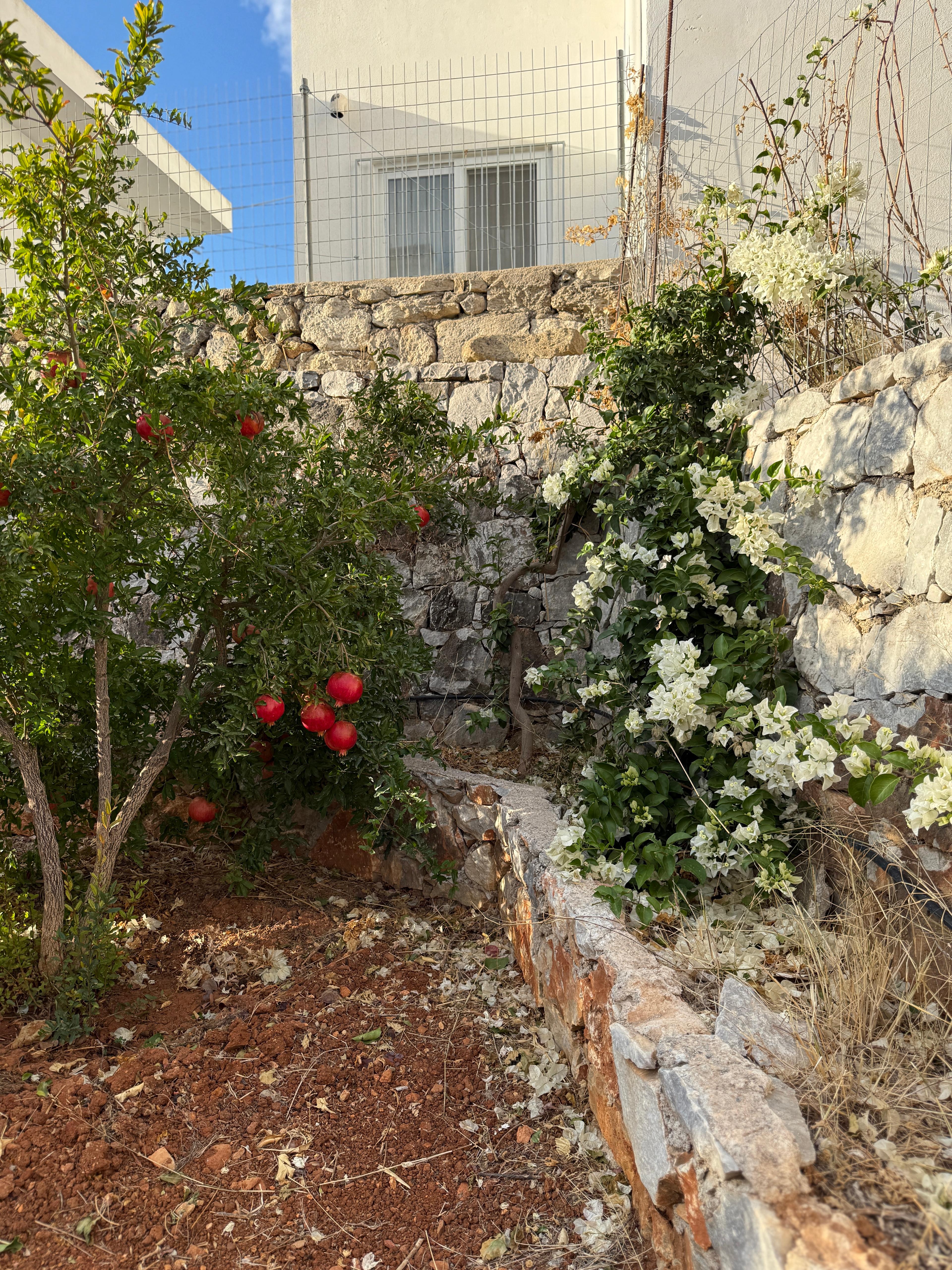 Der Garten mit seinen eigenen Oliven, die Götterfurcht Kaki, Orangen, Granatapfel-Bäume und einer praktischen Regenwasserzisterne fügt sich perfekt in die natürliche Umgebung ein.