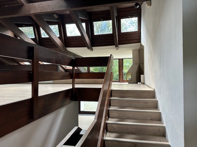 Das Obergeschoss beeindruckt mit vier geschlossenen und zwei offenen Räumen, zwei Bädern und drei Balkonen. Die Raumhöhe variiert zwischen ca. 3 und 7 Metern, was dem Haus eine besondere Großzügigkeit verleiht. Die Architektur setzt auf Helligkeit und schafft somit eine warme Atmosphäre.