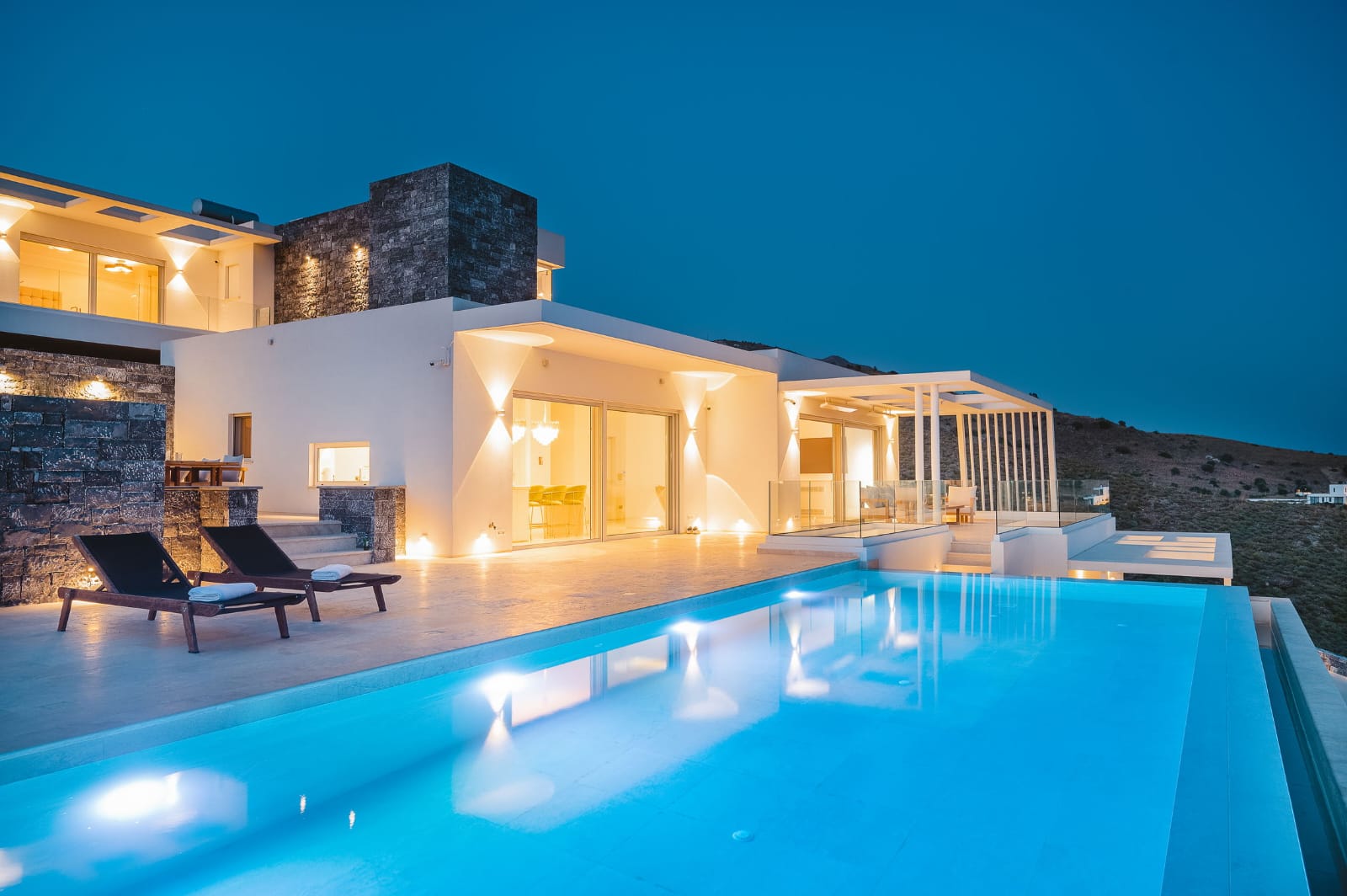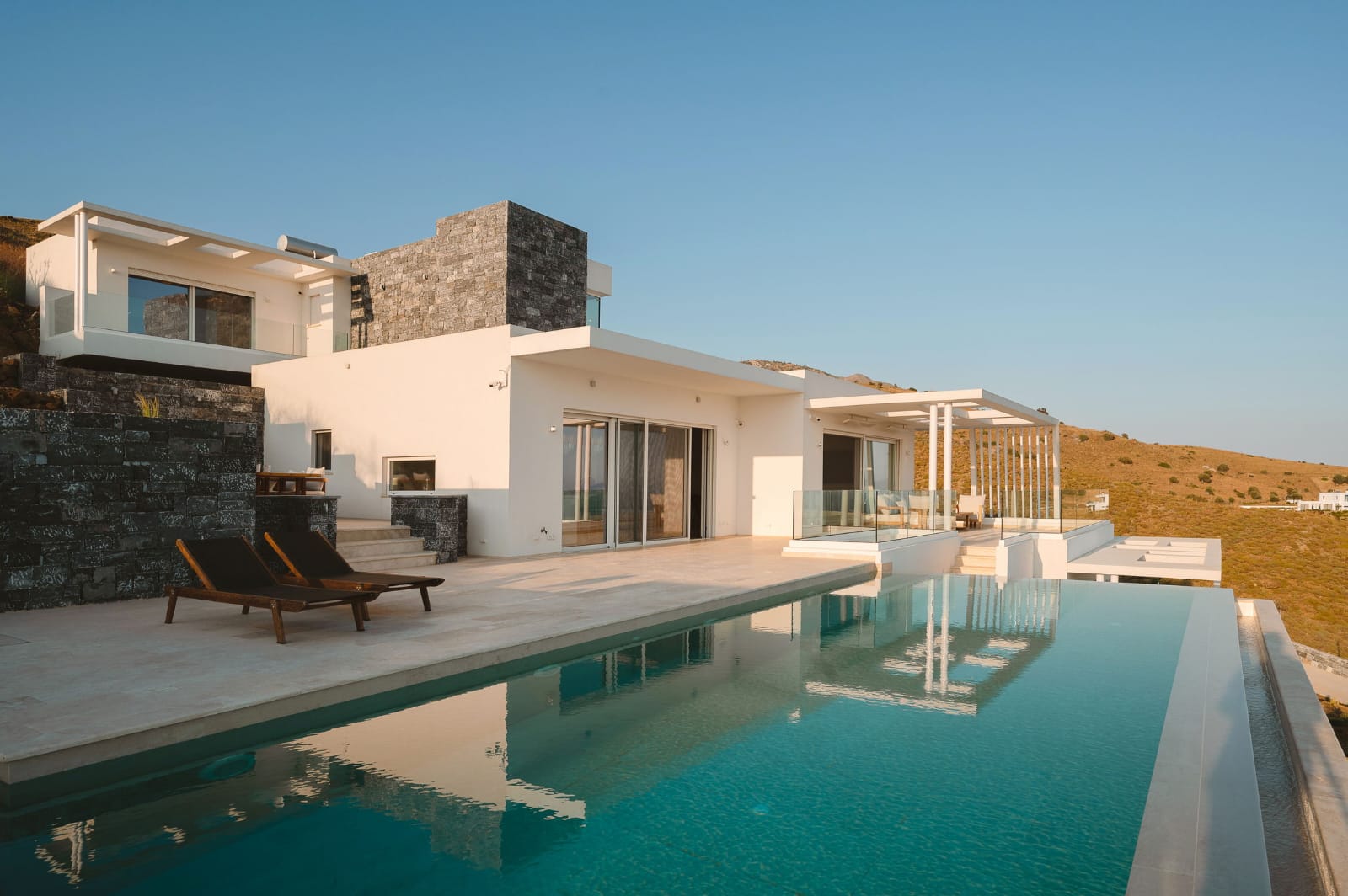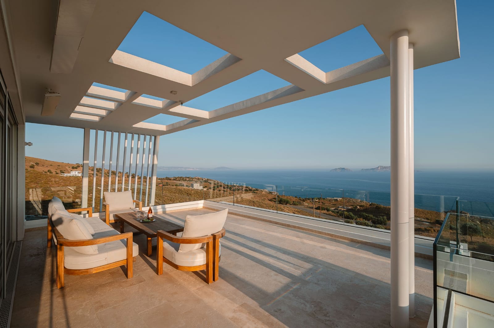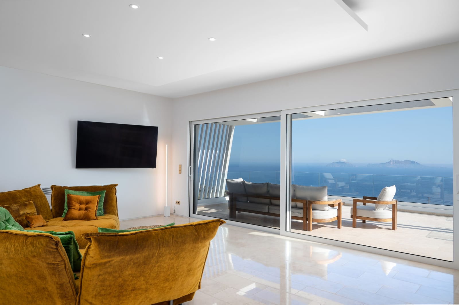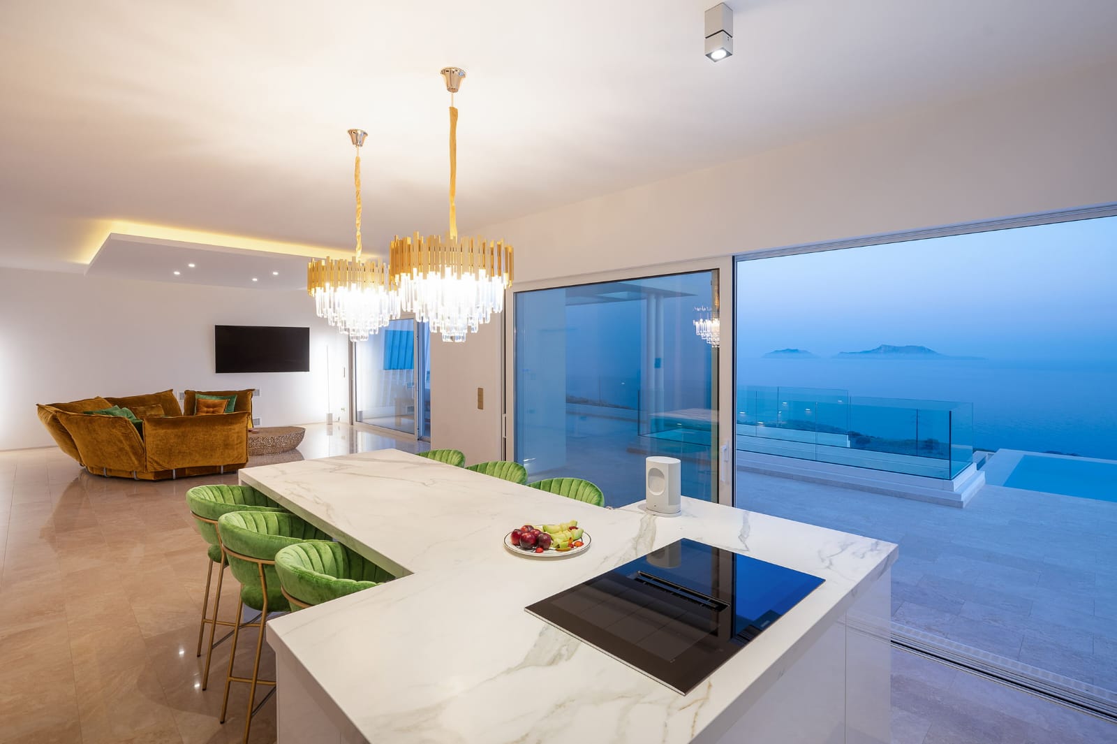 Die Villa erstreckt sich über 353 m² und verbindet mediterrane Leichtigkeit mit zeitloser Eleganz. Großflächige Panoramafenster durchfluten die offenen Wohnbereiche mit Licht und schaffen ein fließendes Zusammenspiel zwischen Innen- und Außenraum.