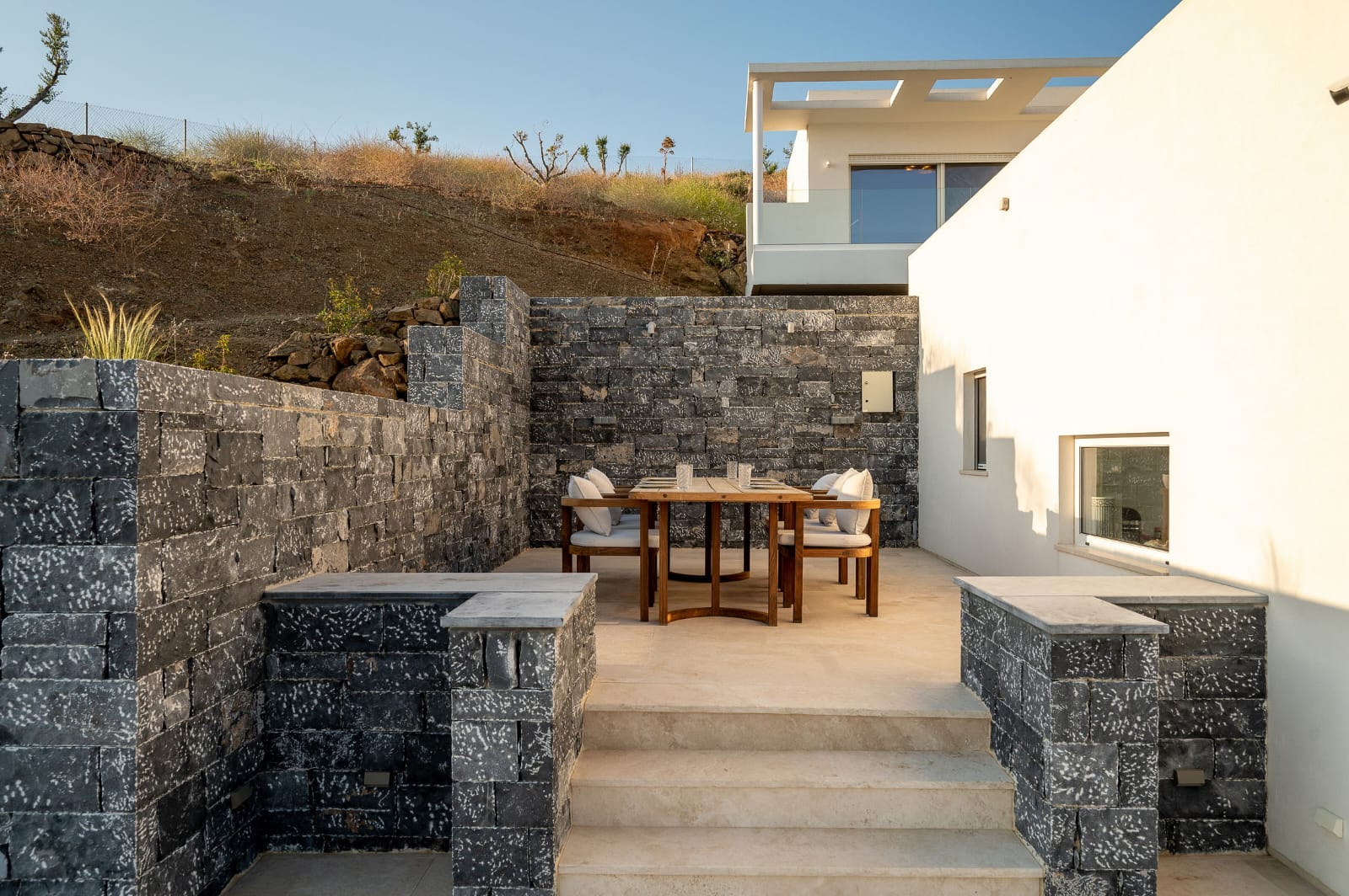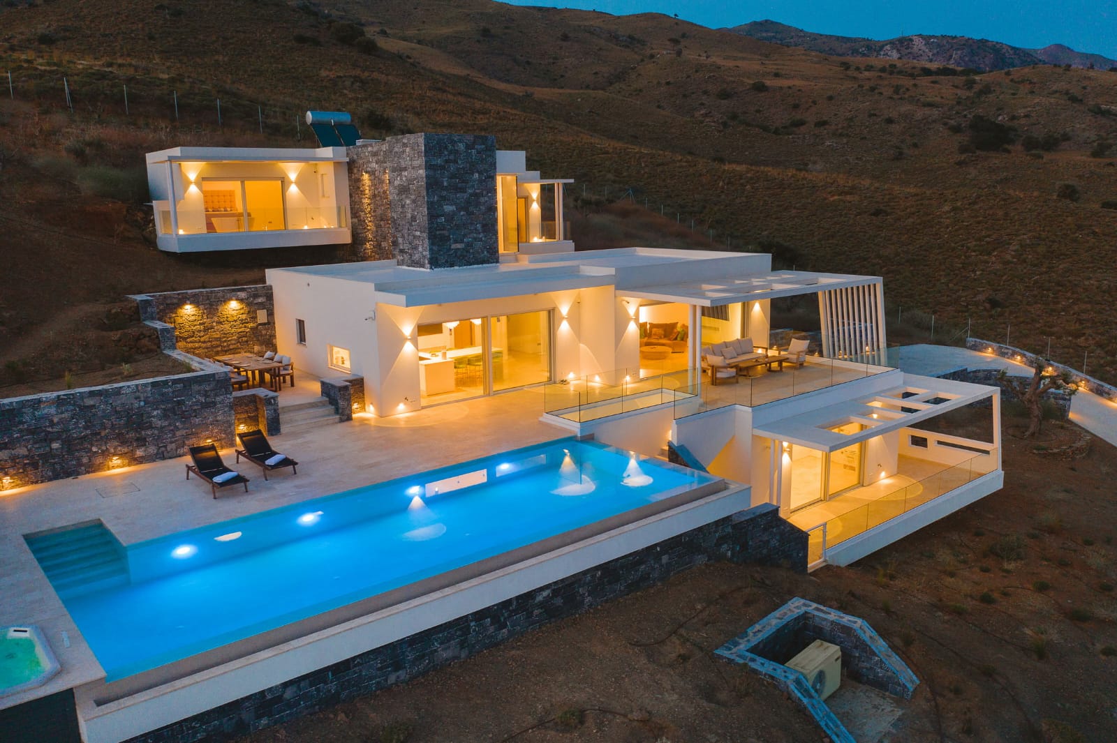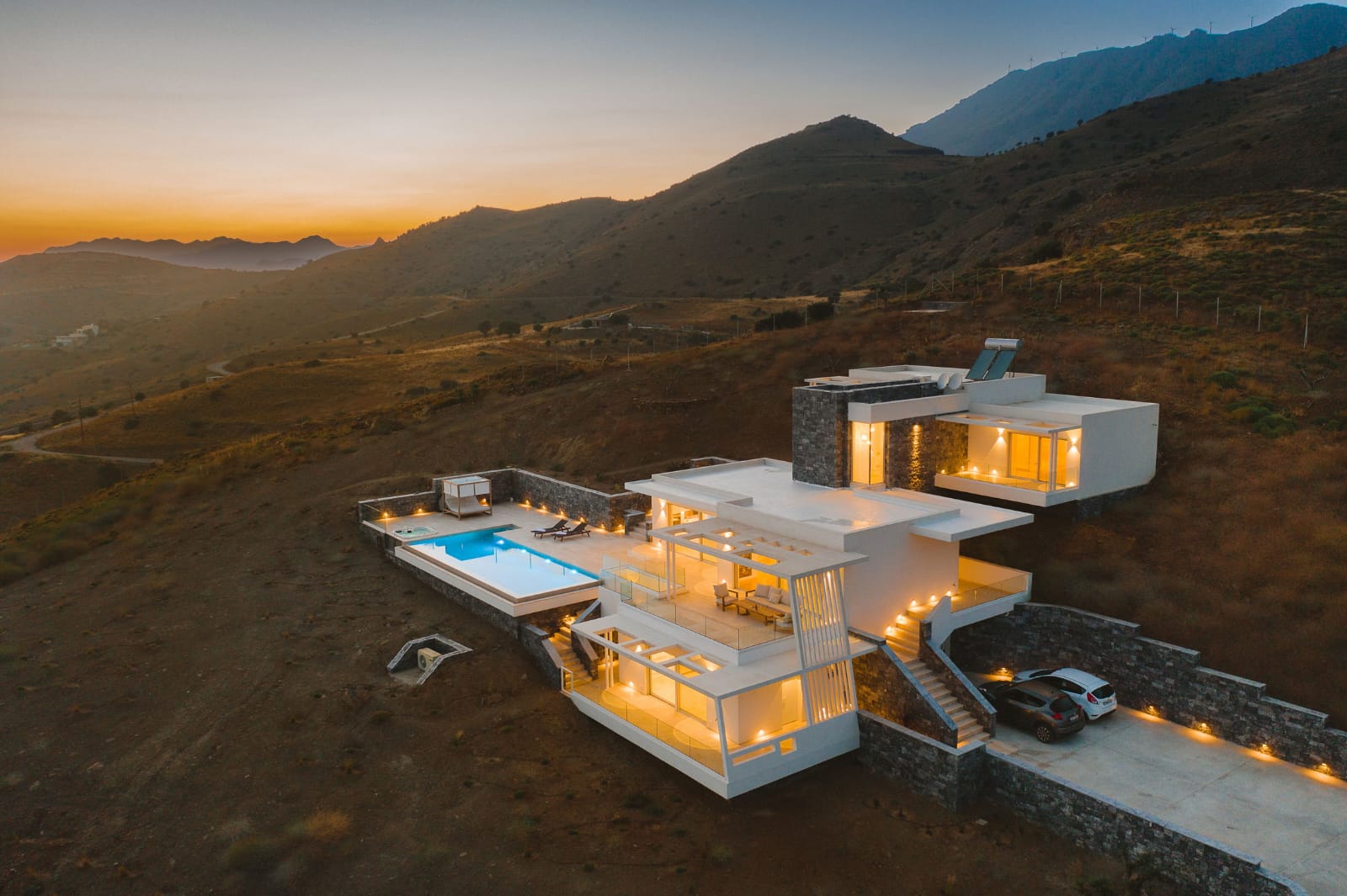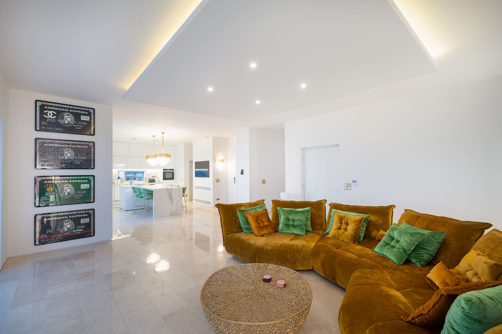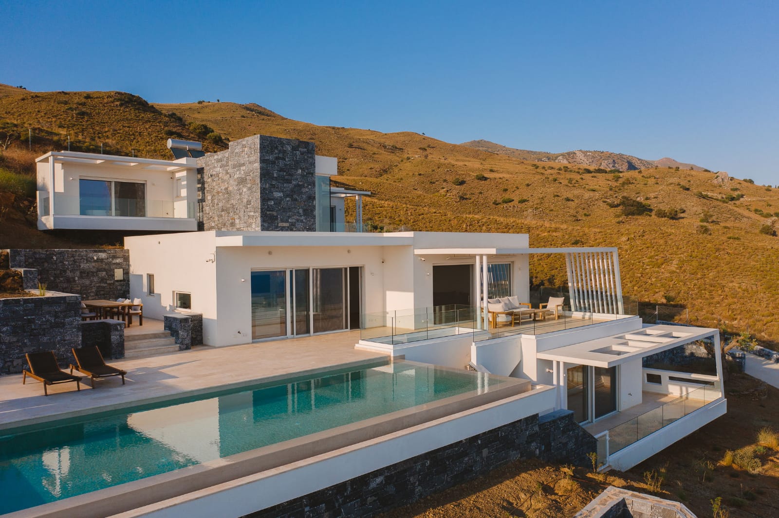 Die Villa erstreckt sich über 353 m² und verbindet mediterrane Leichtigkeit mit zeitloser Eleganz. Großflächige Panoramafenster durchfluten die offenen Wohnbereiche mit Licht und schaffen ein fließendes Zusammenspiel zwischen Innen- und Außenraum.
