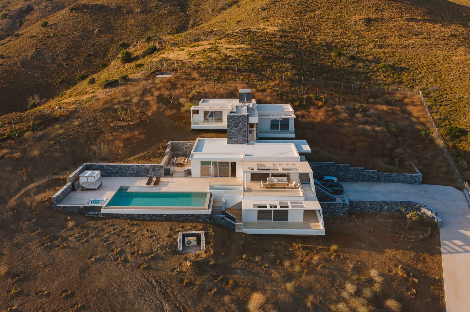 Eingebettet in die wilde Schönheit der süd-kretischen Landschaft erhebt sich diese außergewöhnliche vollmöblierte und bezugsfertige Villa über der Bucht von Agios Pavlos – ein Ort, an dem Ruhe, Design und Natur zu einem Erlebnis von seltener Intensität verschmelzen. Auf einem Grundstück von rund 5.425 m² bietet die 2021 erbaute Immobilie absolute Privatsphäre, modernste Ausstattung und uneingeschränkten Blick über das tiefblaue Mittelmeer.