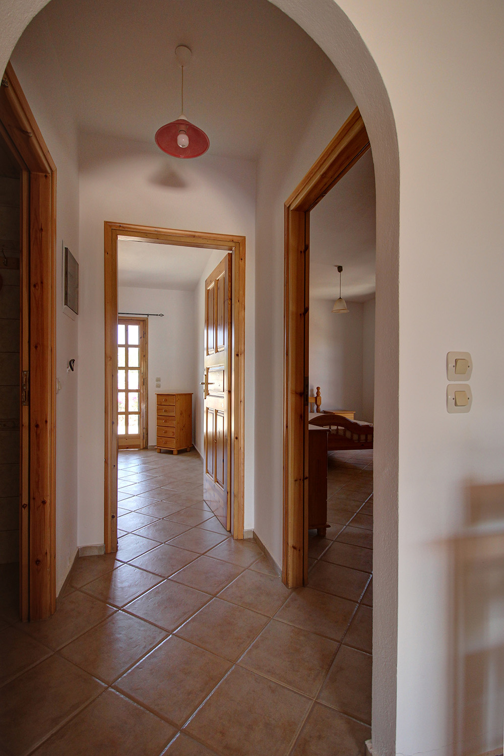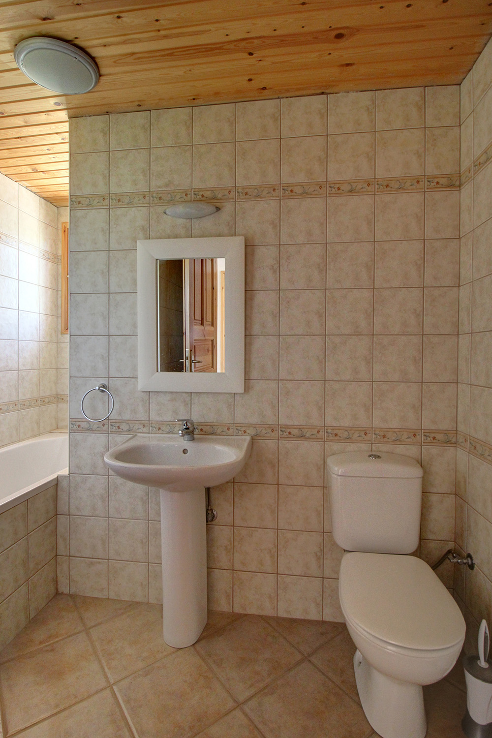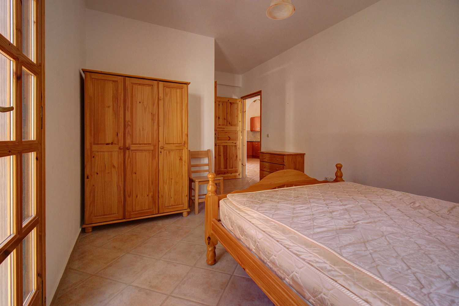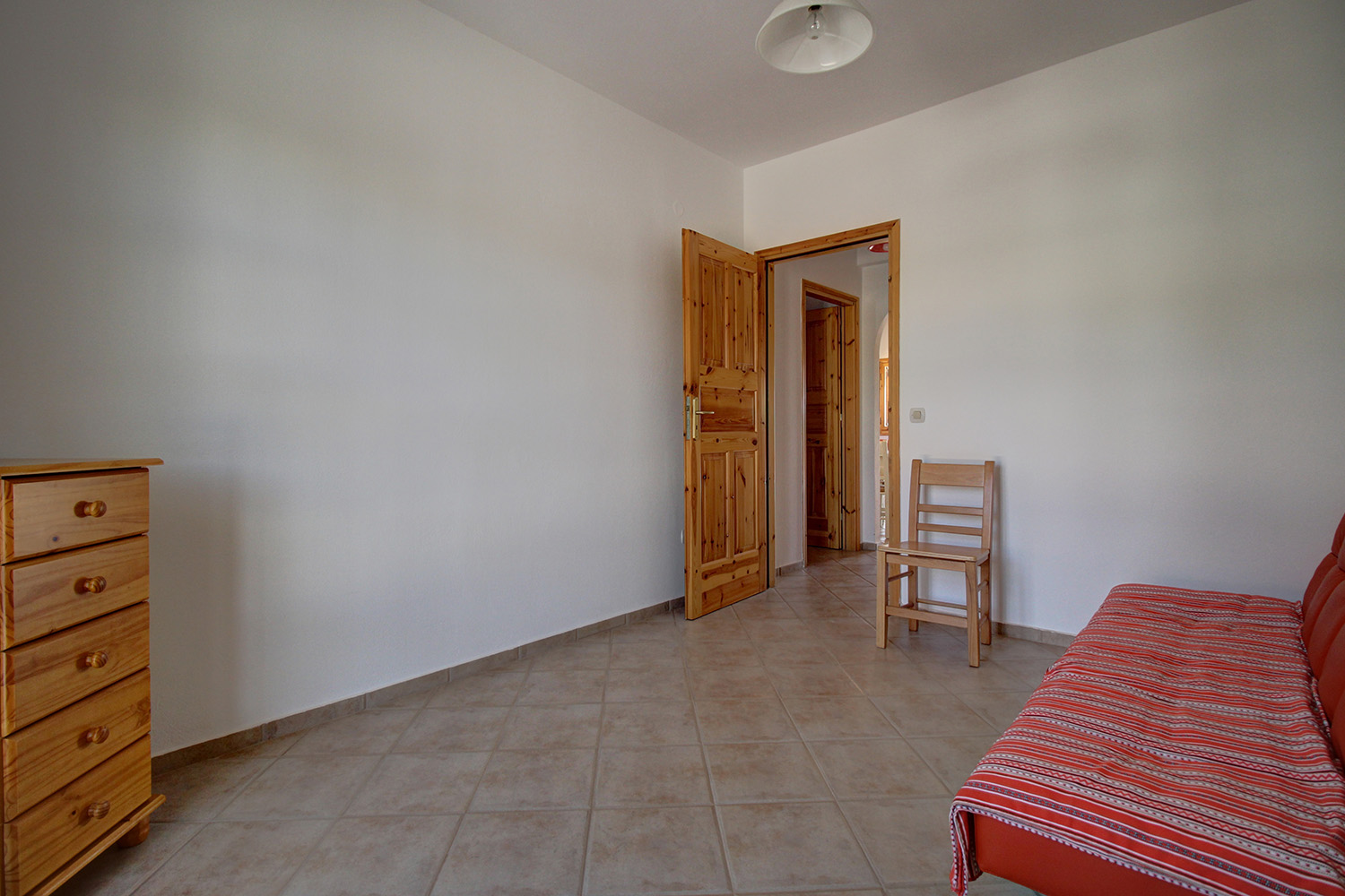 Ein Flur verbindet den Wohnbereich mit einem Badezimmer, das sowohl Badewanne als auch Dusche enthält, sowie zwei Schlafzimmern. Beide Schlafzimmer haben direkten Zugang zum Garten, wobei das Hauptschlafzimmer über ein eigenes Badezimmer verfügt. Das Anwesen ist mit Solarpaneelen ausgestattet und die Verrohrung für eine Zentralheizung ist bereits vorbereitet.